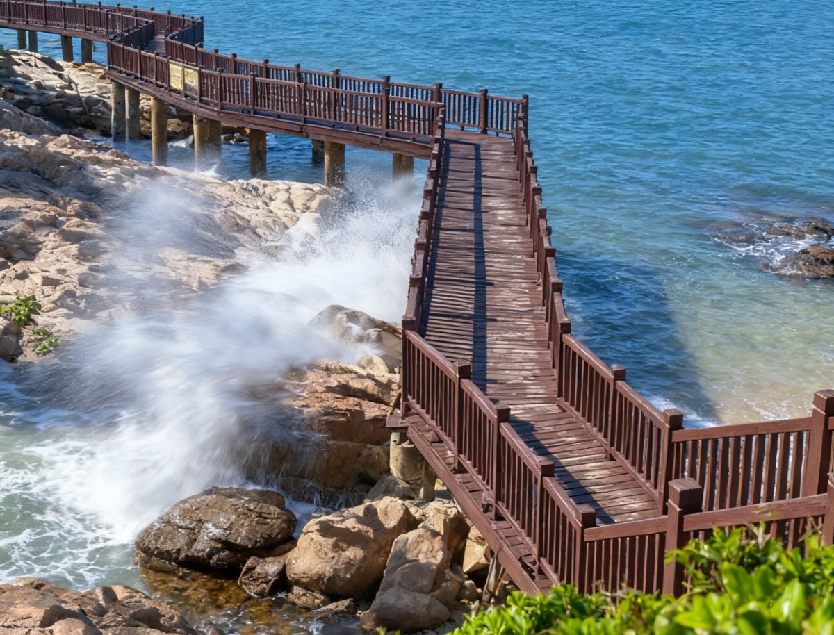 东山岛隶属福建省漳州市东山县,陆地面积188平方千米,占东山县陆地面积的97% ,是福建省第二大海岛 、 东山县第一大海岛 。在清晨微风徐徐的时刻,或是傍晚炎热消散之际,漫步于 东山岛风动石景区海岸边的木栈道 ,聆听那来自大自然的交响曲,确实别有一番惬意滋味。 木栈道沿着 山峦与海洋蜿蜒伸展 ,时而攀升,时而下滑,一边深入大海,一边又穿入林间。靠山的一侧, 各式花草竞相绽放 ,苍松翠柏屹立两旁。